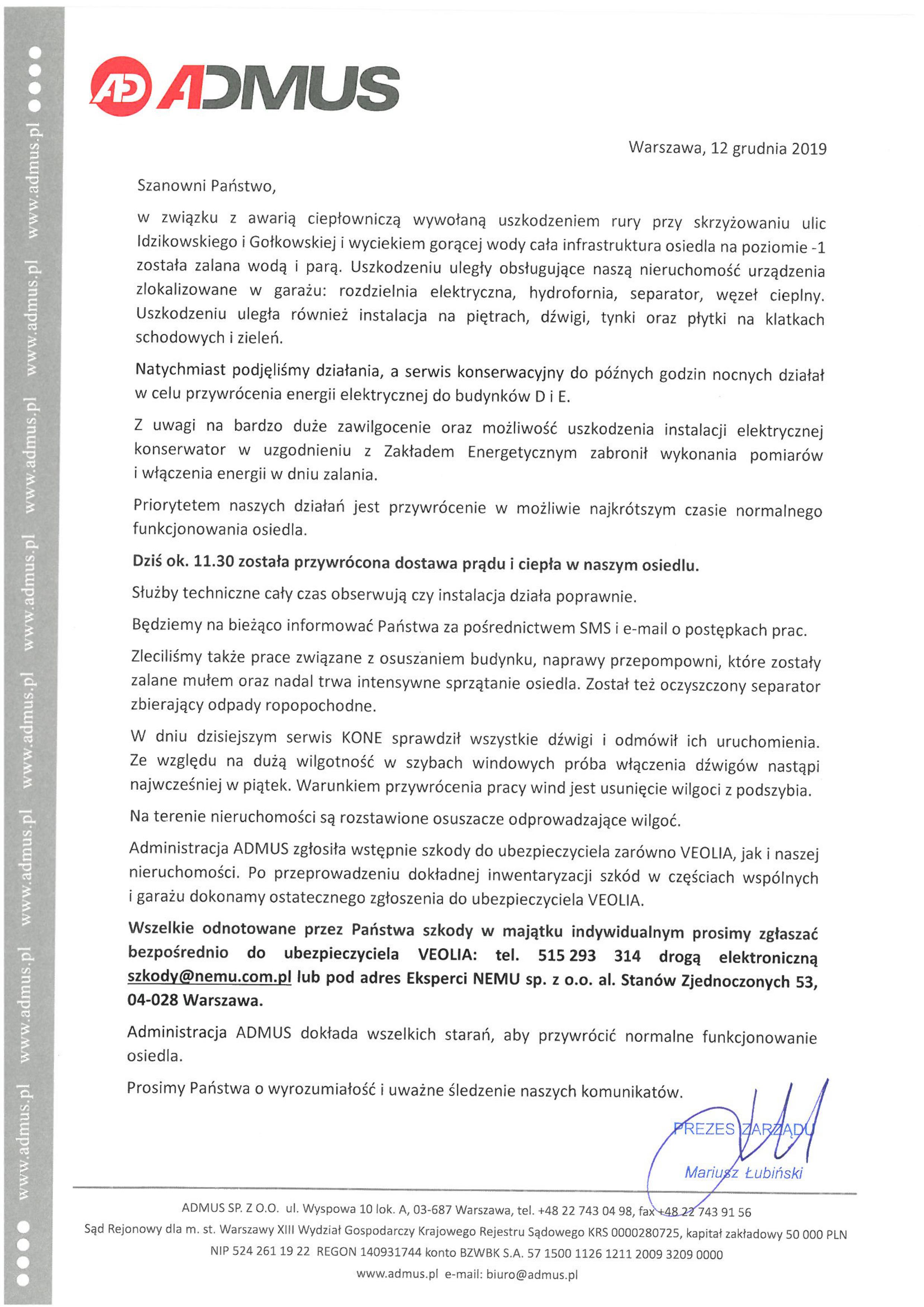 Po zgłoszeniu telefonicznym szkody w dniu zdarzenia, administracja wspólnie z przedstawicielami ubezpieczyciela firmy VEOLA przeprowadziła wczoraj (17.12.2019r.) oględziny na terenie osiedla. Zostały spisane usterki oraz szkody wyrządzone przez awarię sieci ciepłowniczej. Zgłoszenie obejmuje między innymi: spaloną zieleń od gorącej wody na terenie zewnętrznym, windy, rozdzielnie elektryczne, hydrofornie, separatory, zalane posadzki w garażu oraz ściany, odpadające płytki na klatkach schodowych.
